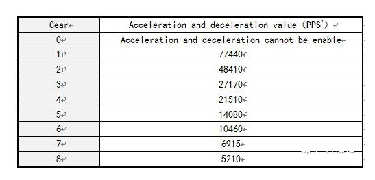 如下圖圖示,42mm兩相混合式步進(jìn)電機(jī)系列系統(tǒng)總線中小型步進(jìn)電機(jī)控制器的加加減速機(jī)時(shí)間分八個(gè)級(jí)別,各自相匹配1-8的加降速指數(shù),標(biāo)值越倍加減速時(shí)間越長(zhǎng)