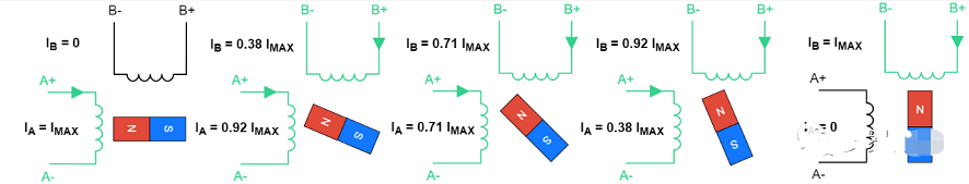因為電流大小不同,將會導致線圈產生的磁場強度不同,從而導致轉子的平衡位置發生變化,這就是微步驅動的原理。