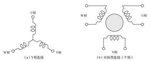 圖 3(a)所示的是三相繞組(U、V、W)采用 Y 形連接(星形連接)的方式。這種方式需要引出 3 個接線端子,需要采用 6 個晶體管的三相橋式電路驅(qū)動。但是,這種方式只能進行二相激勵。如果你想分別單獨控制各相的電流,則需要 如圖 3(b)所示從每相引出 2 個端子,且需要 3 組全橋電路來驅(qū)動。