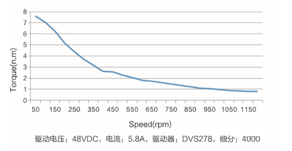 步進(jìn)電機(jī)和伺服電機(jī)不同,他的力矩輸出不是恒定的,隨著轉(zhuǎn)速的升高力矩會(huì)下降,所以步進(jìn)沒(méi)有額定力矩的說(shuō)法,只有靜力矩參數(shù),就是電機(jī)激磁,速度接近0時(shí)的力矩就是步進(jìn)電機(jī)的最大力矩。所以步進(jìn)電機(jī)的選型不得不考慮他的力矩速度特性曲線,下圖是米格兩項(xiàng)8牛米步進(jìn)電機(jī)的力矩速度特性曲線圖。