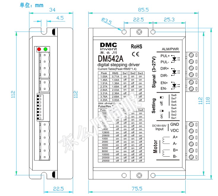 DM542A型驅(qū)動(dòng)器,比M542 具有更低的電機(jī)發(fā)熱、運(yùn)行噪聲和更高的平穩(wěn)性,以及更低的成本,主要驅(qū)動(dòng)42、57型兩相混合式步進(jìn)電機(jī)。其微步細(xì)分?jǐn)?shù)有15種,最大步數(shù)為25000Pulse/rev;其工作峰值電流范圍為1A-4.2A,輸出電流共有8檔,電流的分辨率約為0.45A;具有自動(dòng)半流,過(guò)壓和過(guò)流保護(hù)等功能。本驅(qū)動(dòng)器為直流供電,建議工作電壓范圍為24VDC-36VDC,電壓不超過(guò)50VDC,不低于20VDCd